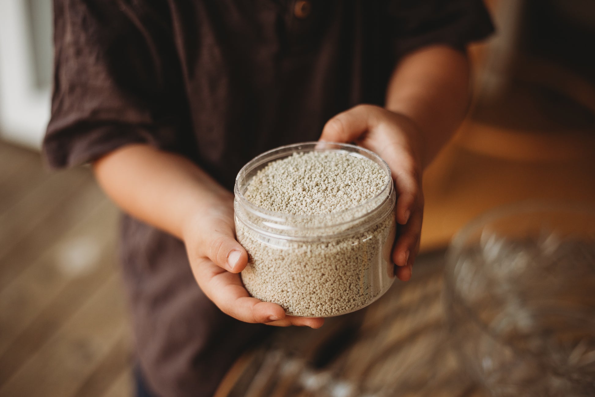 Fizz is the most wonderful sensory experience. When you drop it in a bowl of water it will explode into bubbles, or you can slowly add spoons of water for a longer fizzy play.