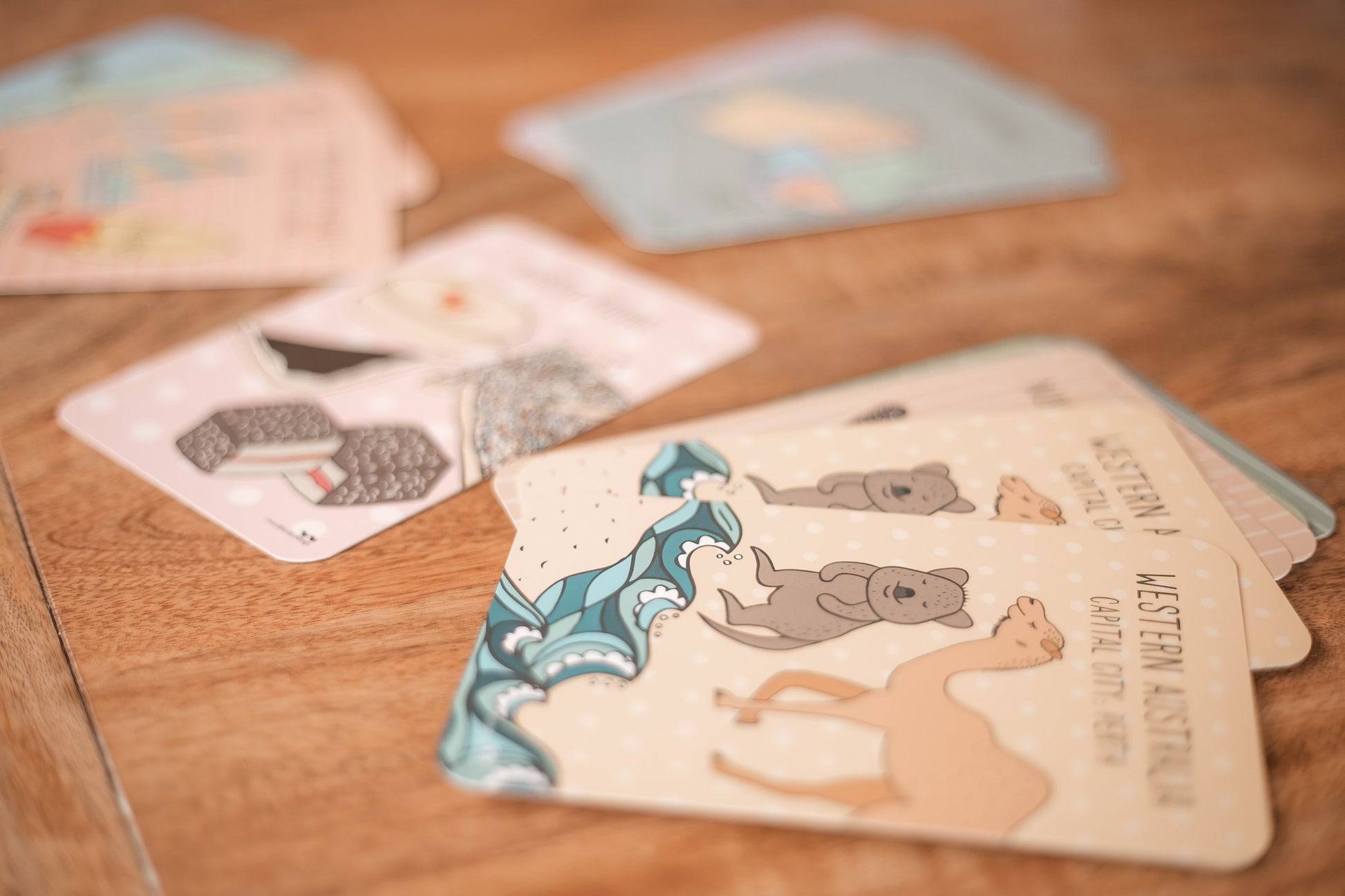 Test your memory, speed and visual skill while learning a little bit about Australia with these aussie cards. Each card is laminated and features rounded corners for long life and durability. Proudly Australian made and printed on environmentally friendly paper. Cards are 10cm x 15cm in size. There are 26 cards with 13 different designs and 1 instruction card.