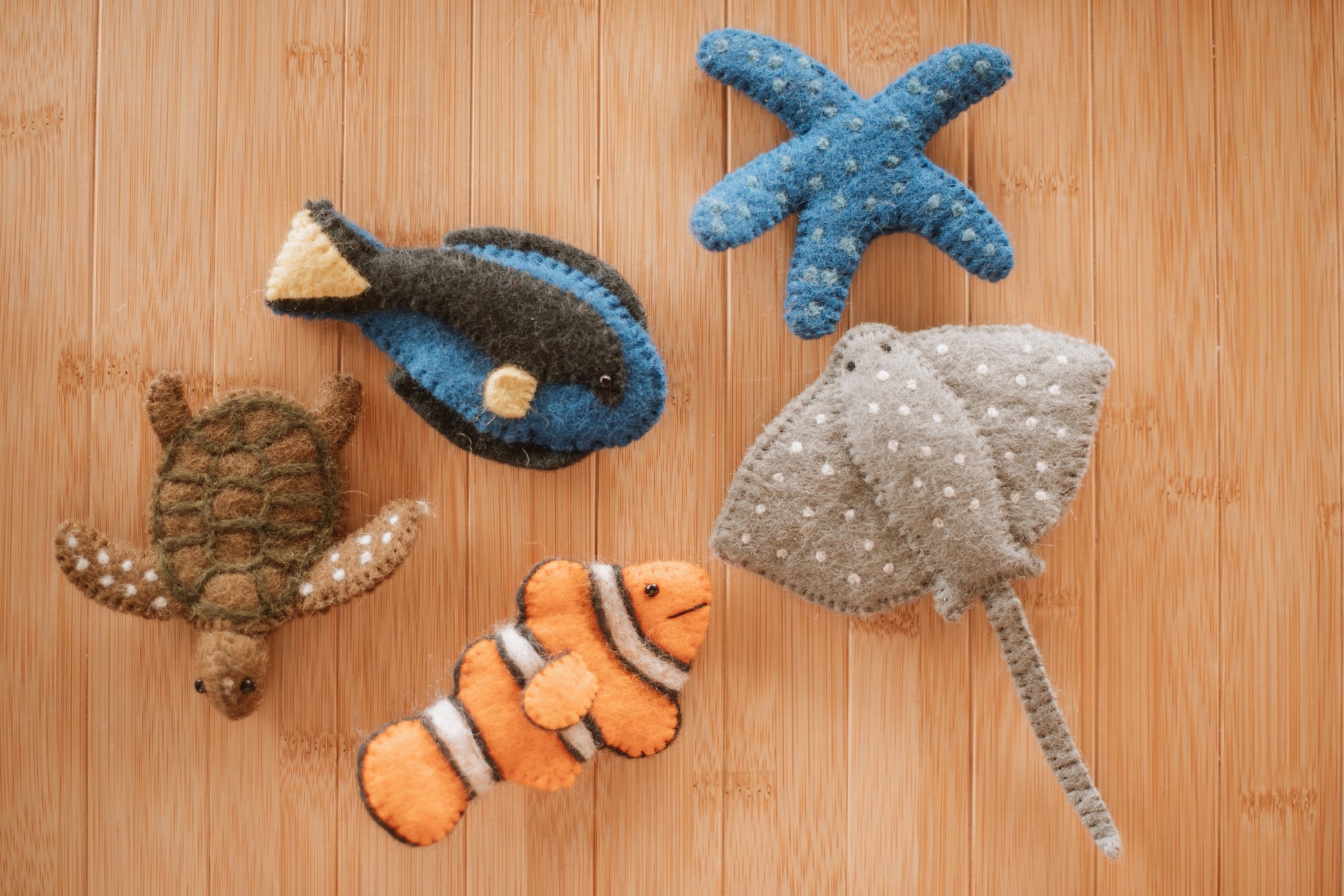 Our Australian Coral Reef finger puppets set consists of unique ocean creatures that can be found under the sea off the coasts of Australia - Blue Tang Fish, Green Sea Turtle, Clownfish, Blue Sea Star and Spotted Ray. Check out the details on each finger puppet!