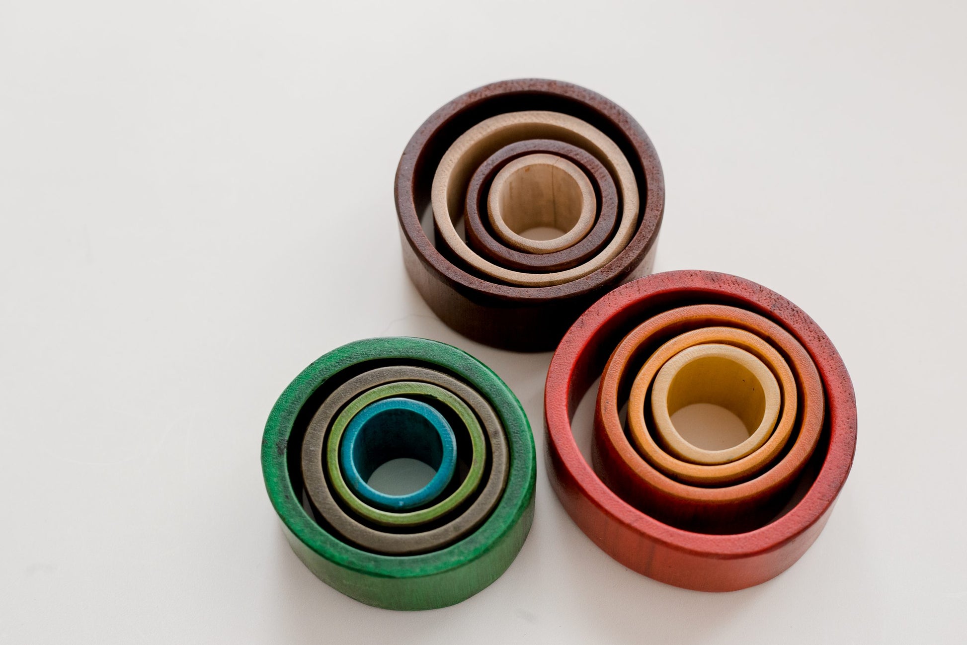 A open ended set of bamboo nesting rings. Including 3 sets, total 12 bamboo rings.