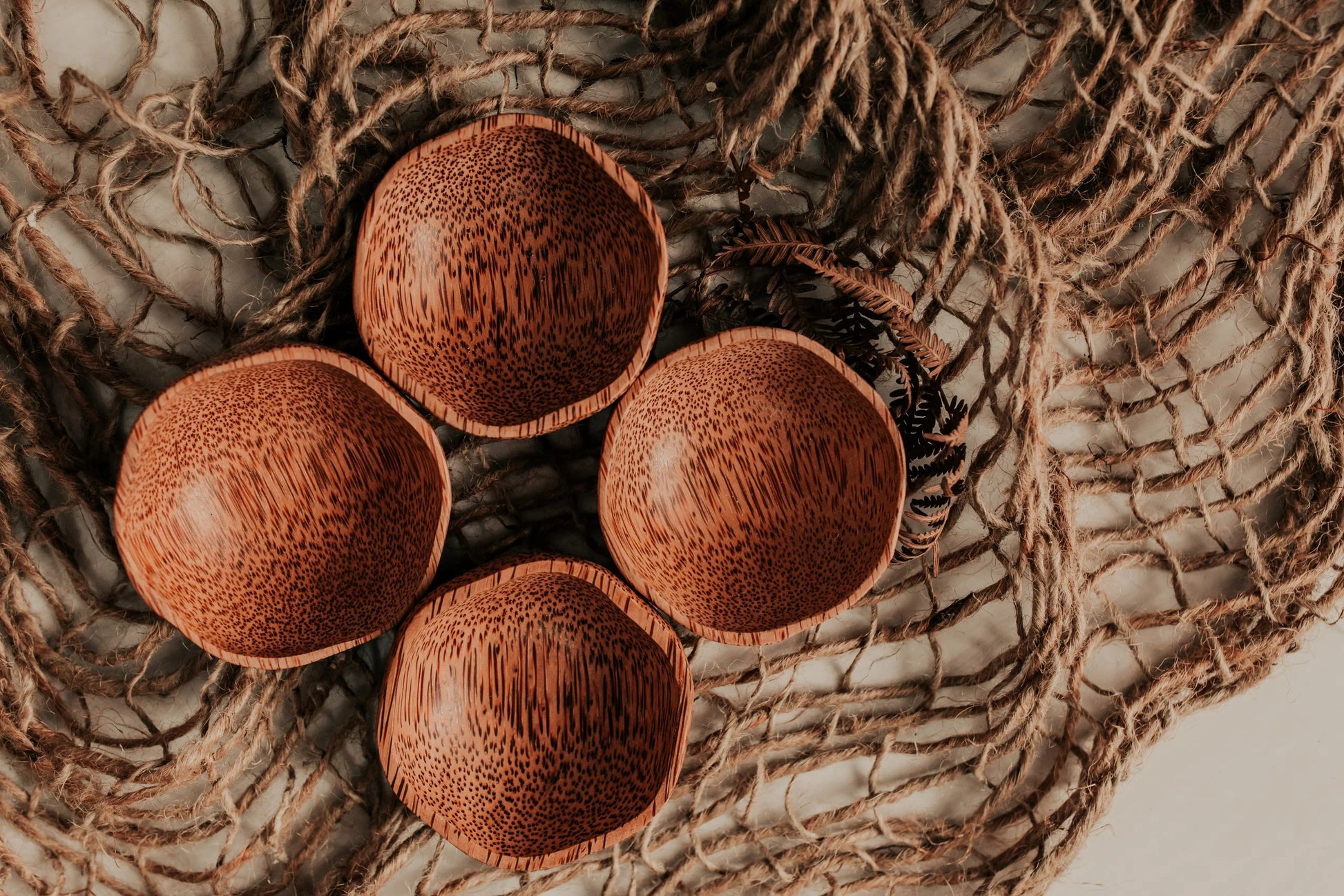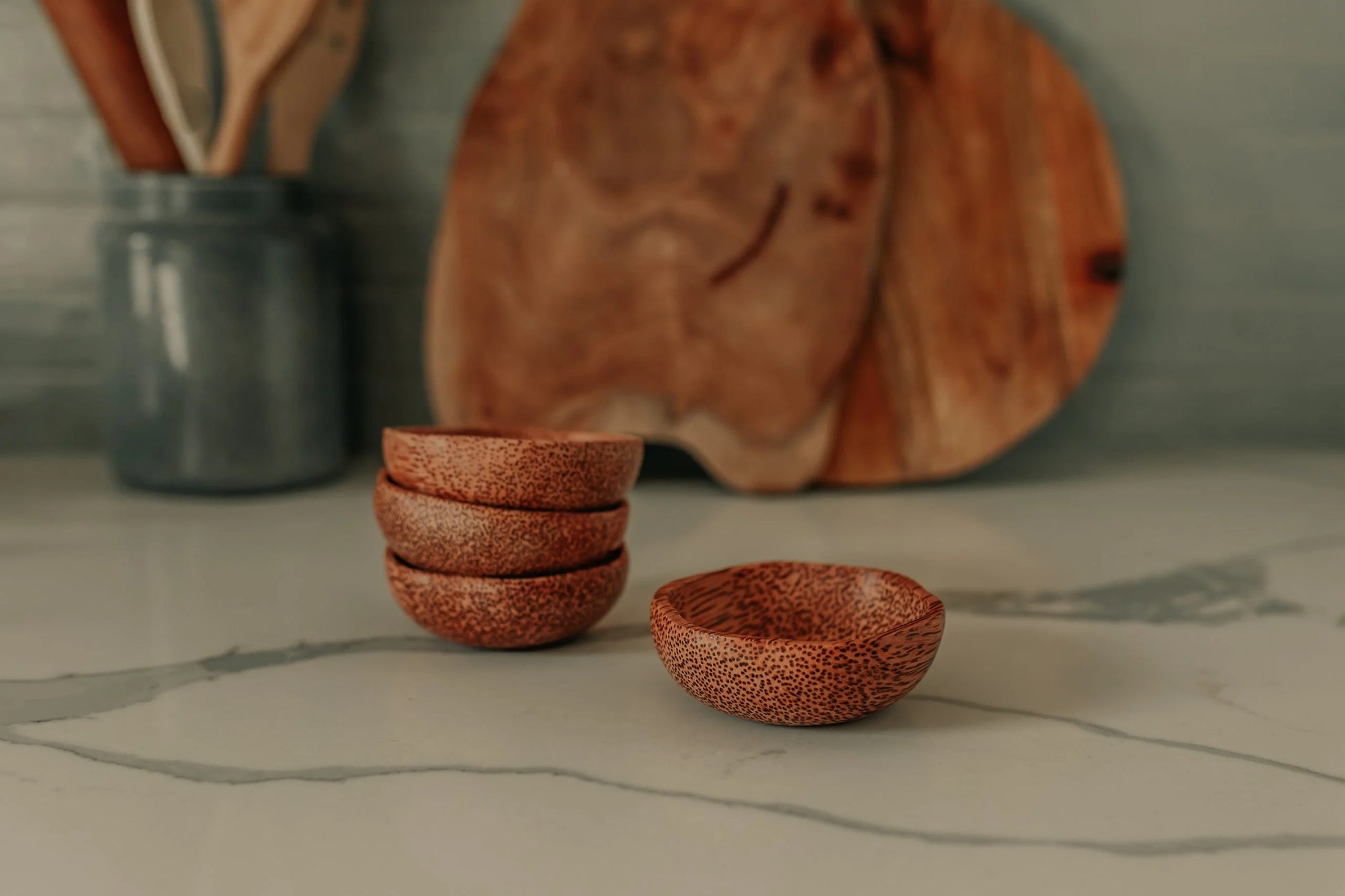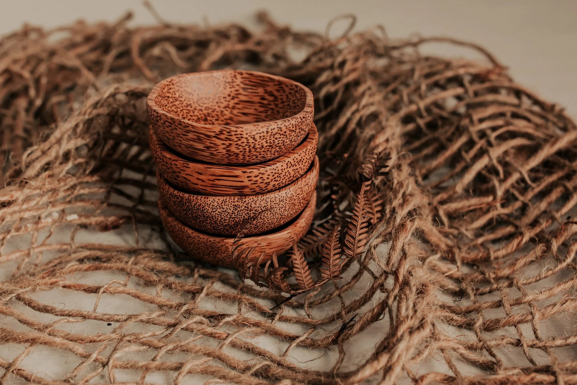 A set of 4 small dipping plum bowls made from coconut wood.