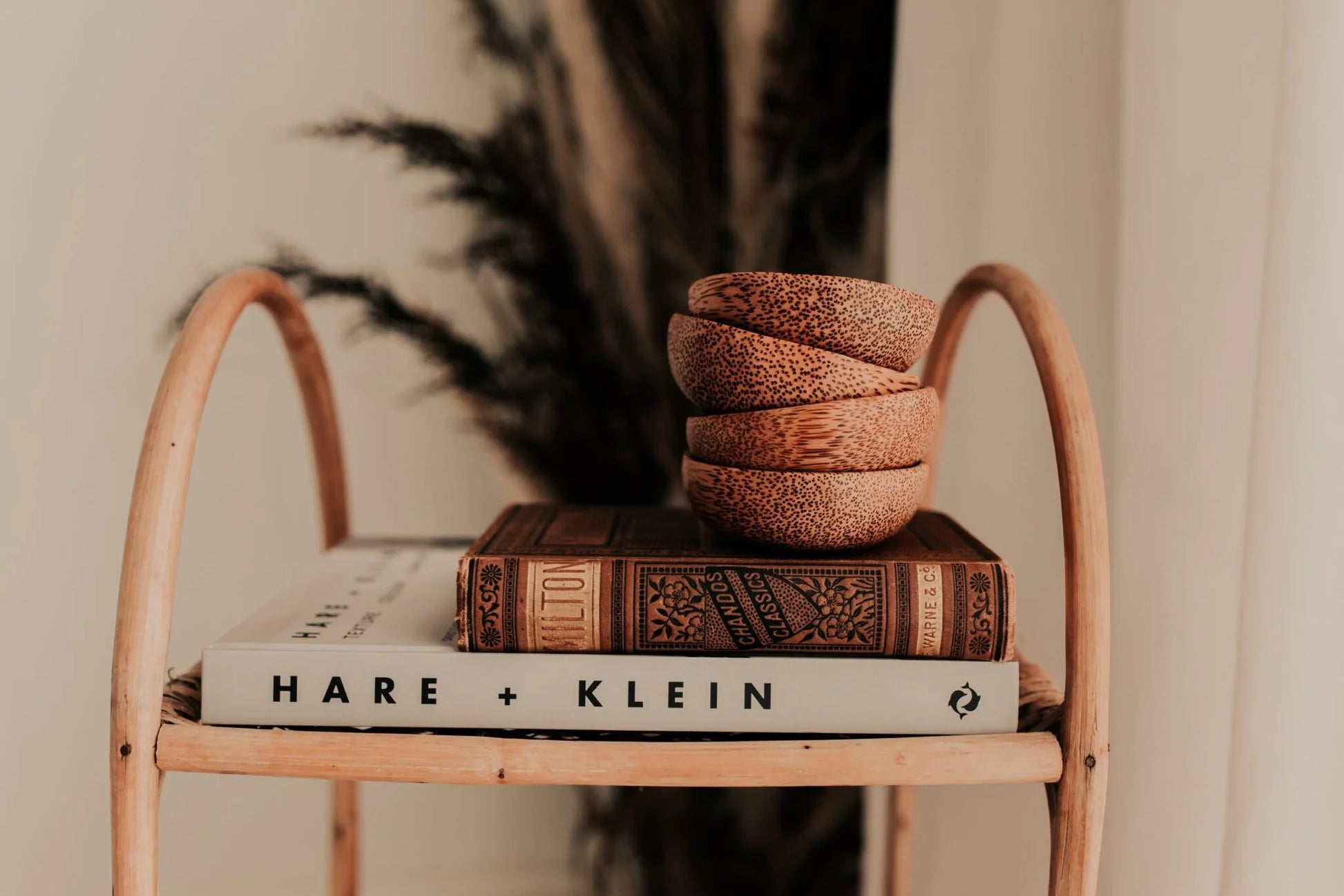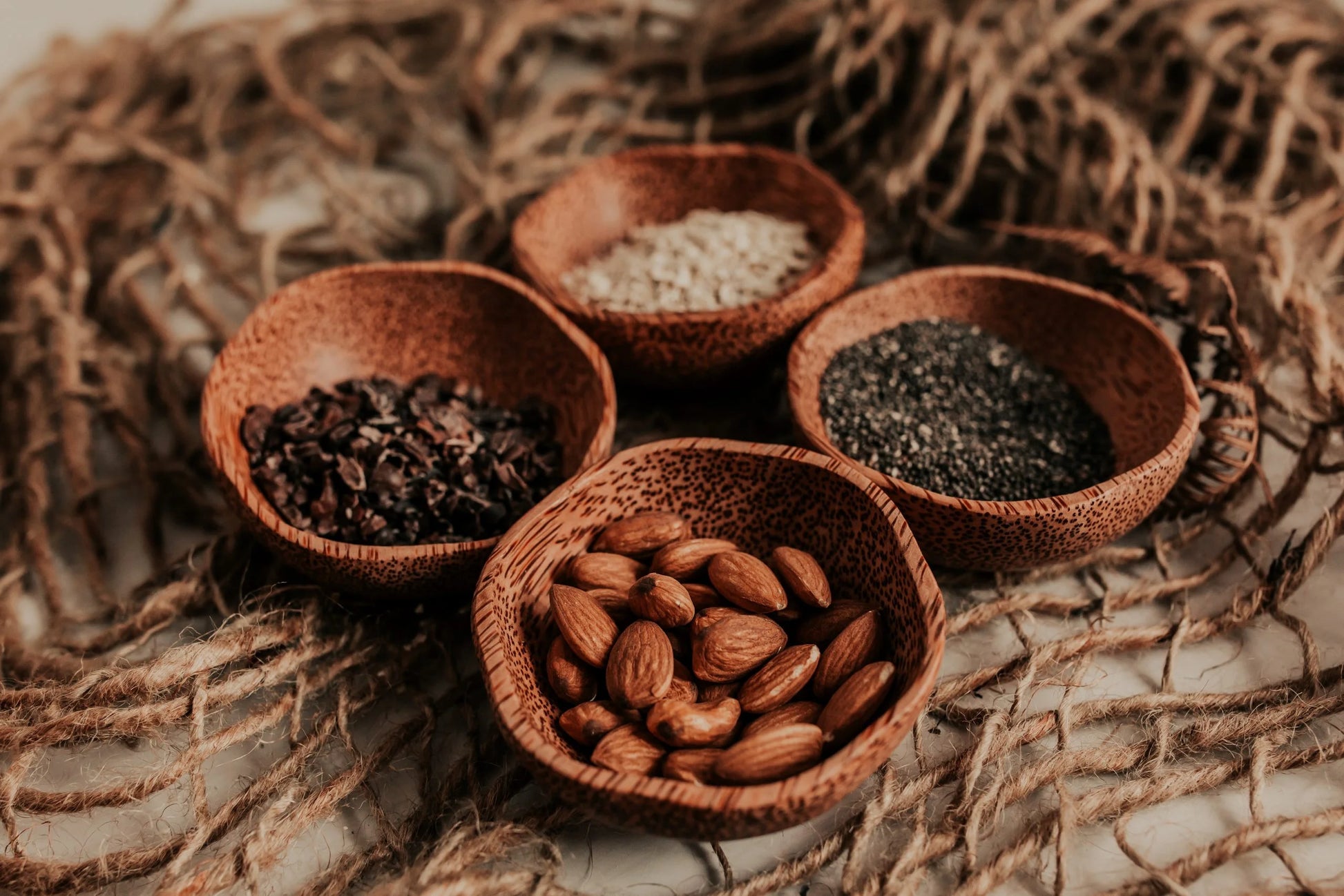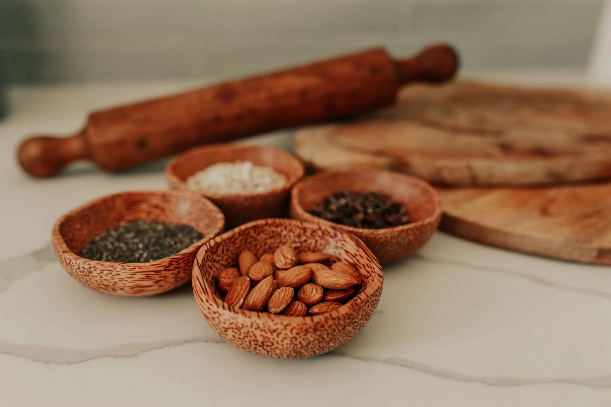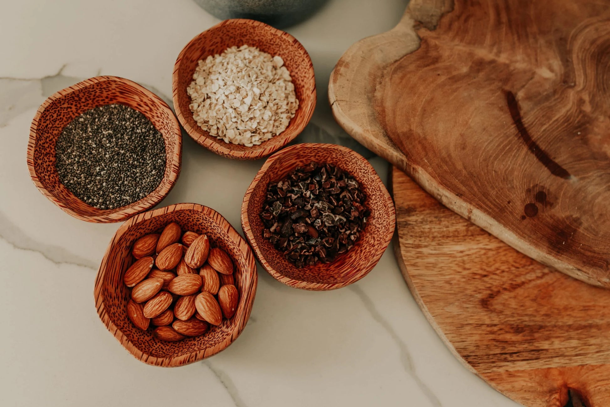 A set of 4 small dipping plum bowls made from coconut wood.