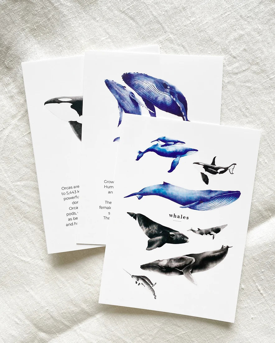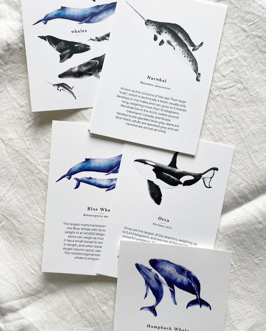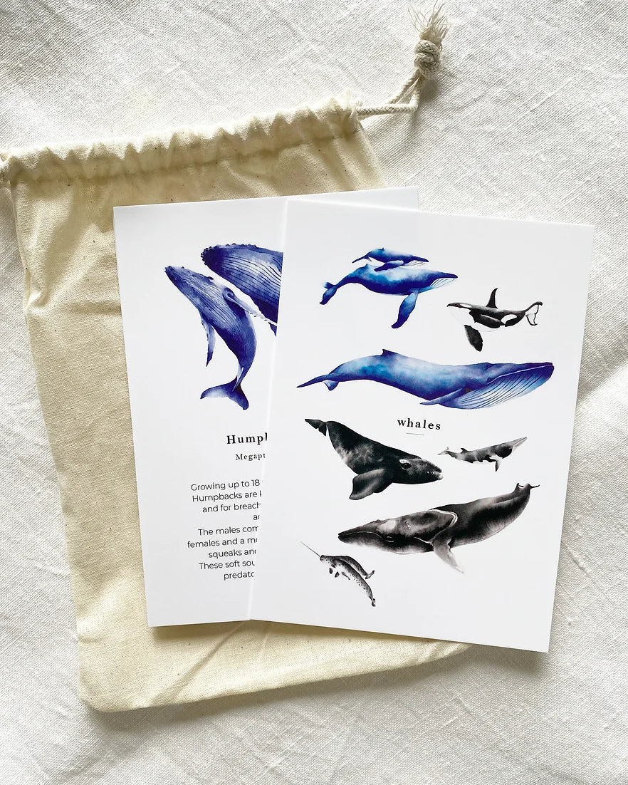 Help grow and challenge little minds with this set of flash cards, featuring artwork lovingly handpainted by Amy Mulholland. This set of 8 cards features 7 different whale species and interesting facts about each whale.