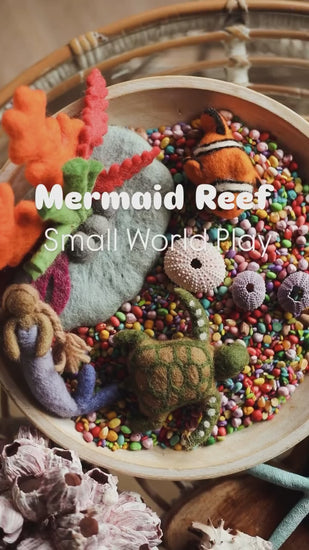 The vibrant reefs around Australia inspired this little felt Coral Reef and its Clownfish friend. The Clownfish can be detached from the Coral Reef, "swimming" off by itself! This gorgeous felt Coral Reef and Clownfish has been meticulously felted and just perfect for bookish play and small world play.