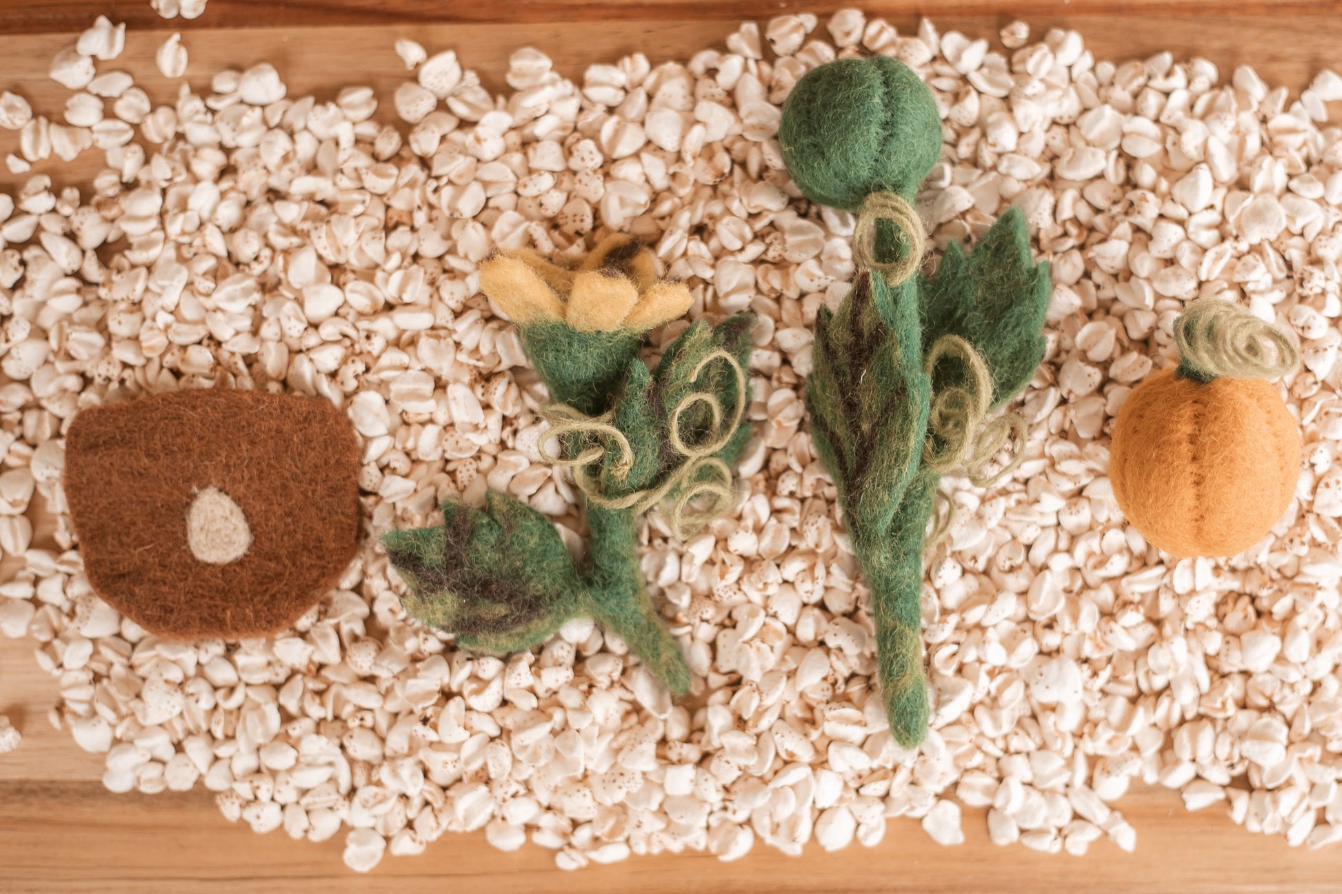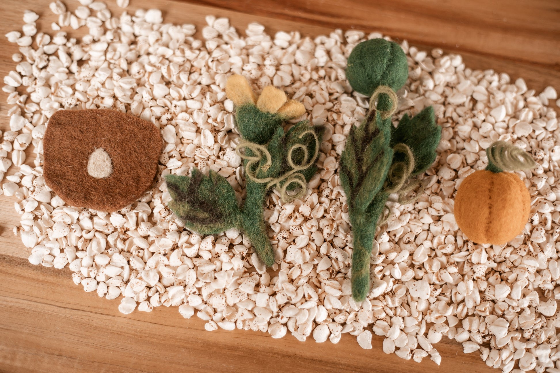 These gorgeous Pumpkin life cycle toys have been needle-felted and great for small world play and silk play. These lifecycle toys will arrive packaged in a cotton calico bag.
