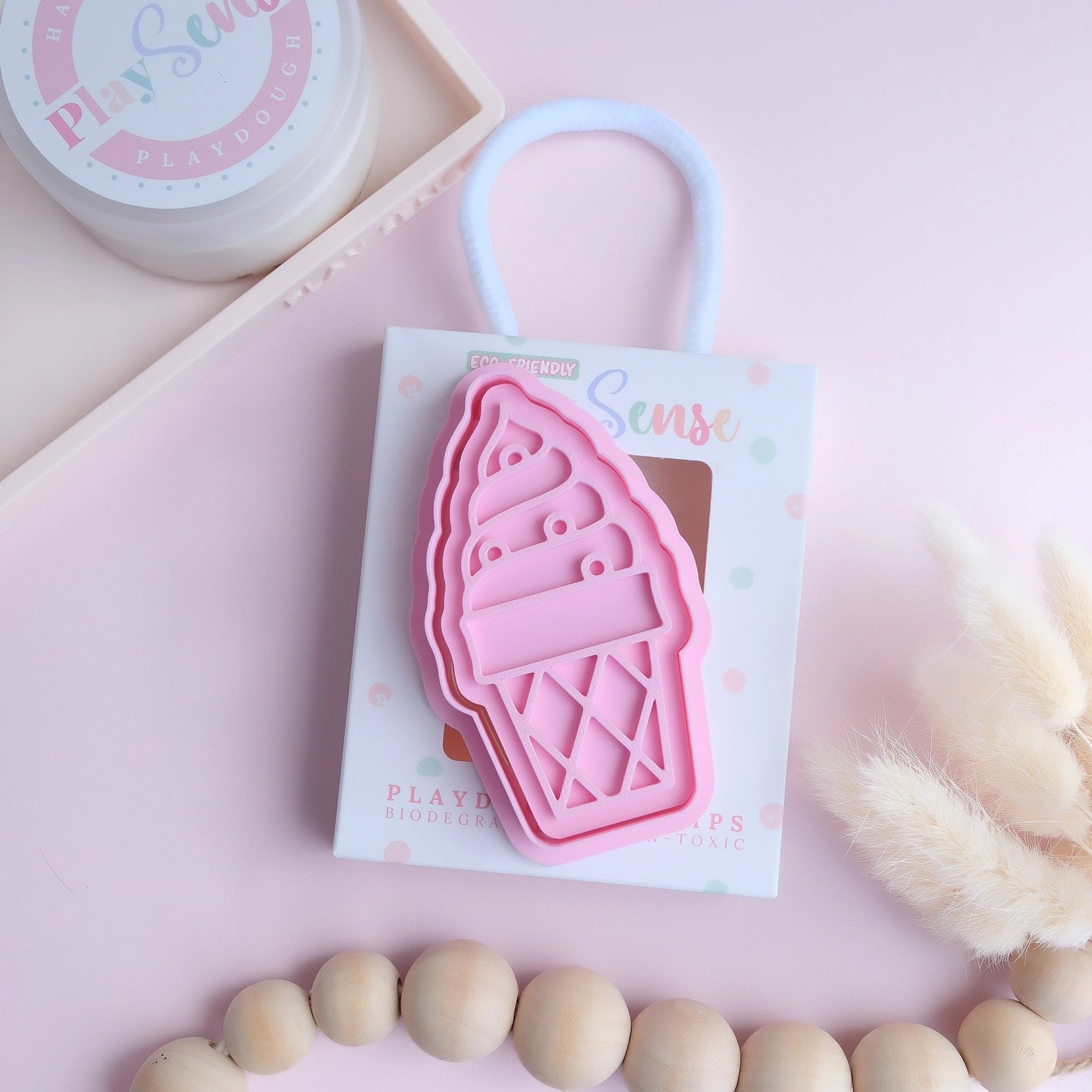 Play Sense Stamp & Cutter Name: Ice Cream with sprinkles Colour: Pink Packaging: Retail-ready packaging with an integrated handle, perfect for hanging display.