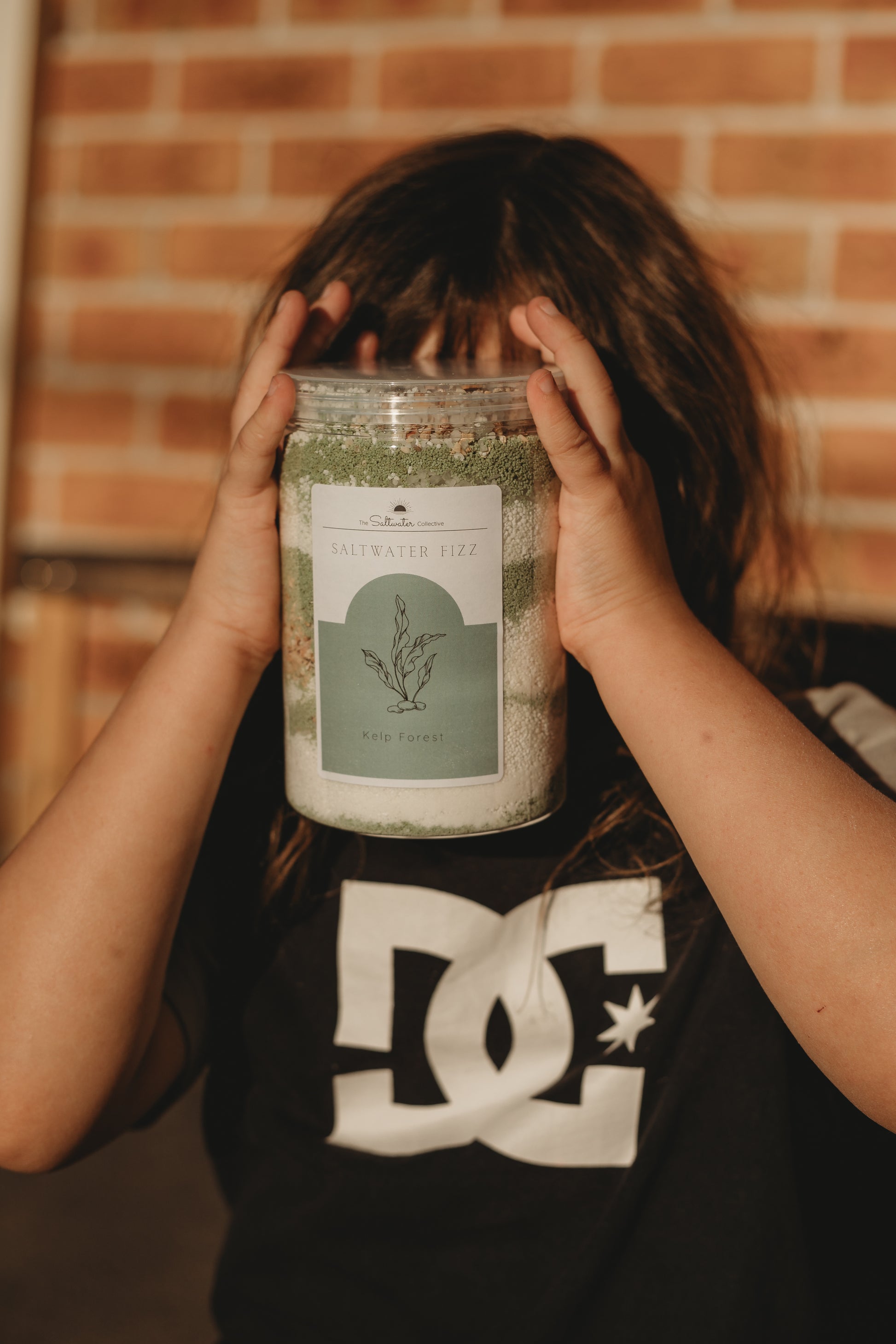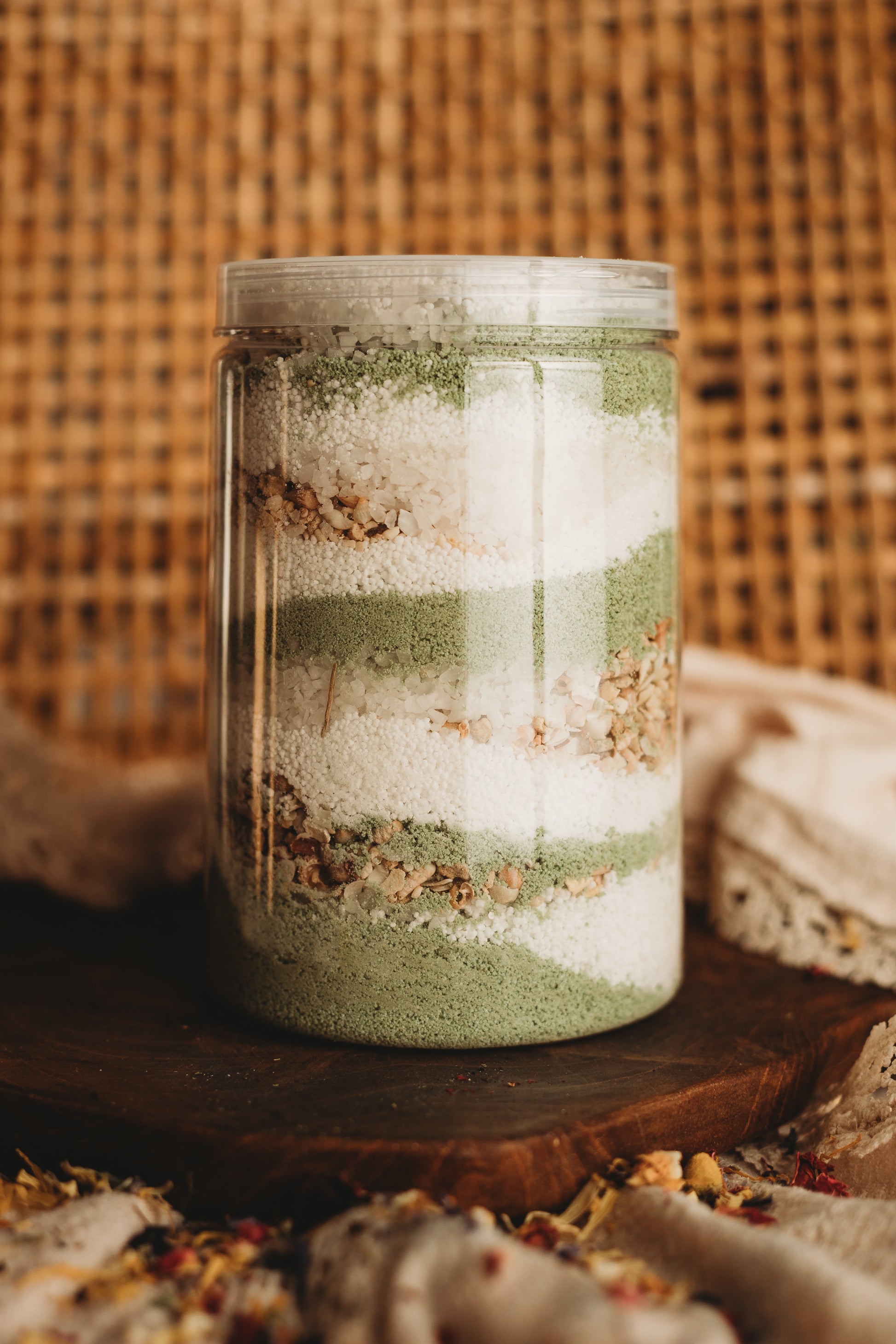 An olive green and white fizz mixed with delightful tiny sea shells and rock salt, for potion play.