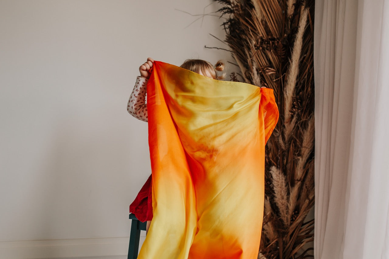 Play silks, a staple in any playroom. These wonderful toys may not seem like a ‘toy’ but put them in the hands of a child and what will emerge can be surprising. There are so many ways to play with this simple toy that is only limited by imagination.