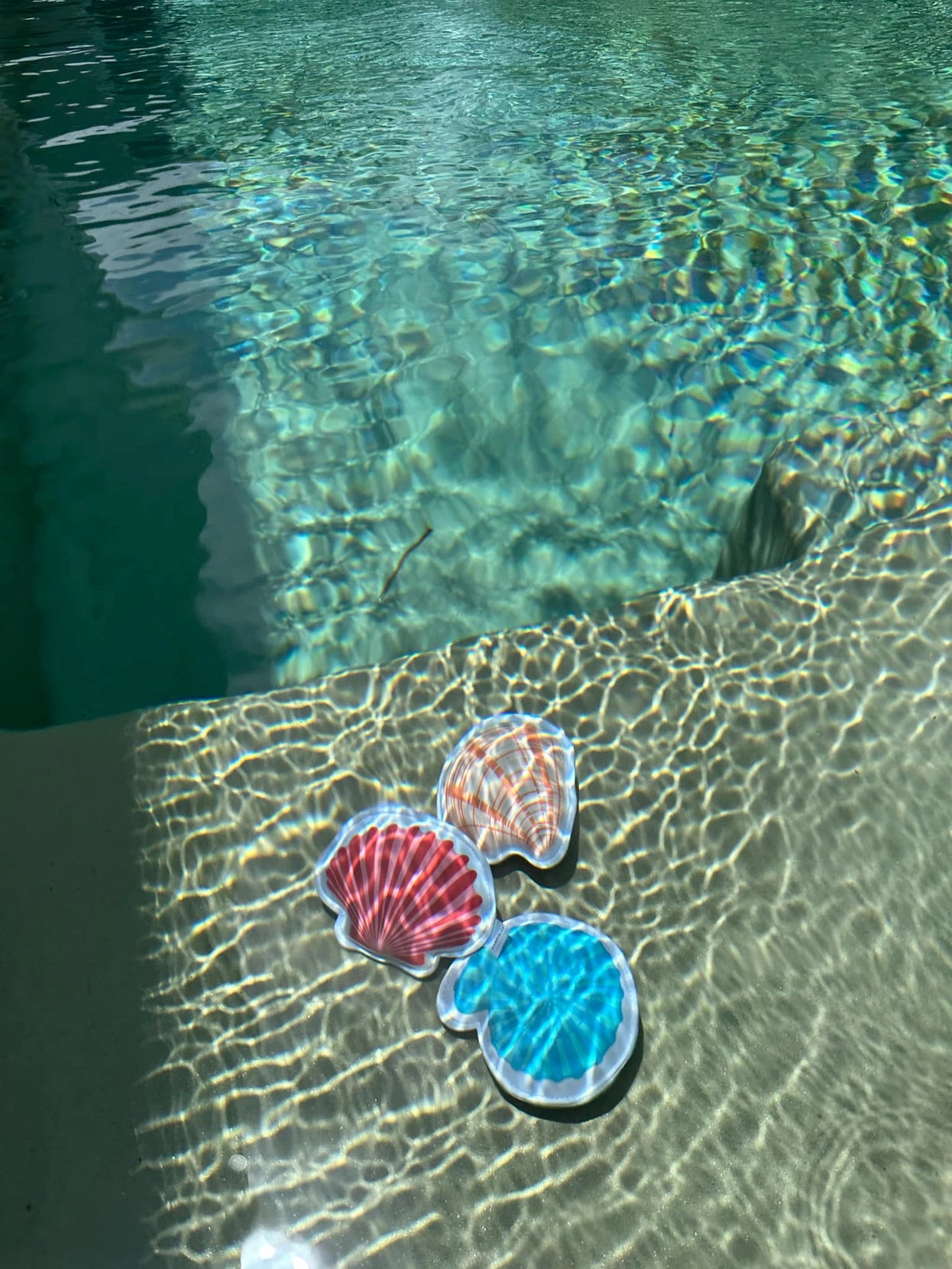 The Shoal Bay Sinking Shells are made from soft neoprene and filled with sand to allow them to sink and rest on the pool floor.