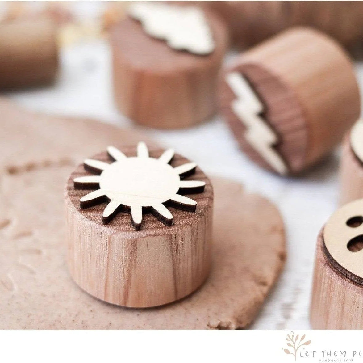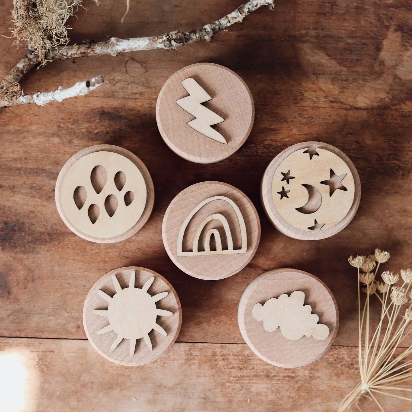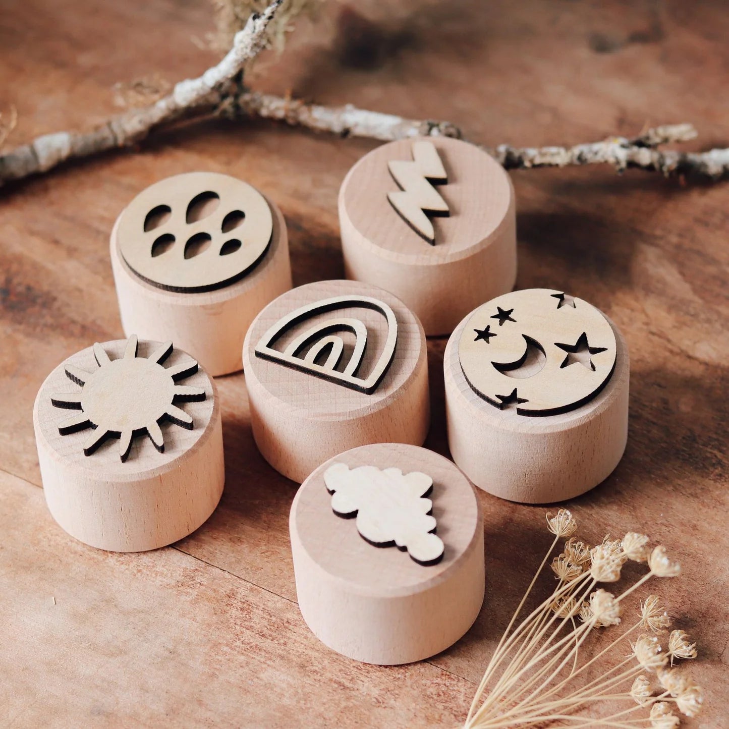 It's a beautiful day for stamping! With these Wooden Stampers - Weather, you can add a natural touch to your sensory fun! Perfect for creative play, they add a whimsical, weather-themed element to your play dough, clay, or kinetic sand. Enjoy sunny skies or rain showers, without getting your feet wet!