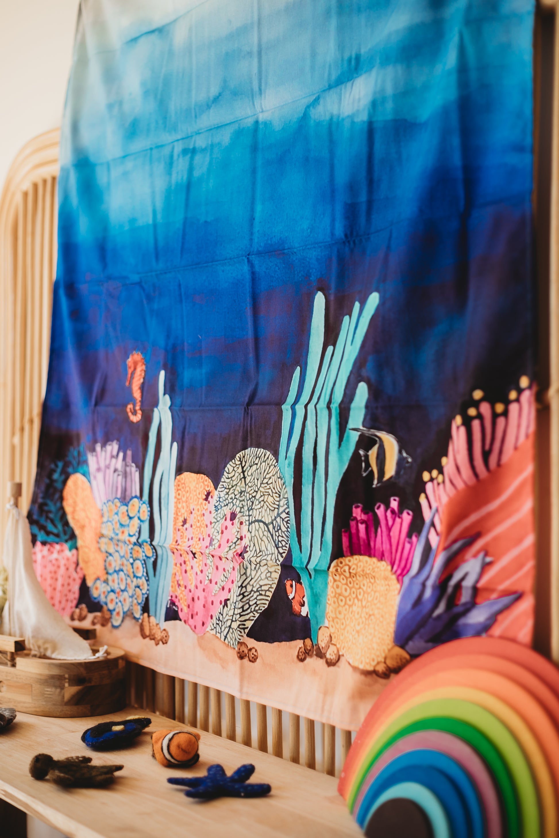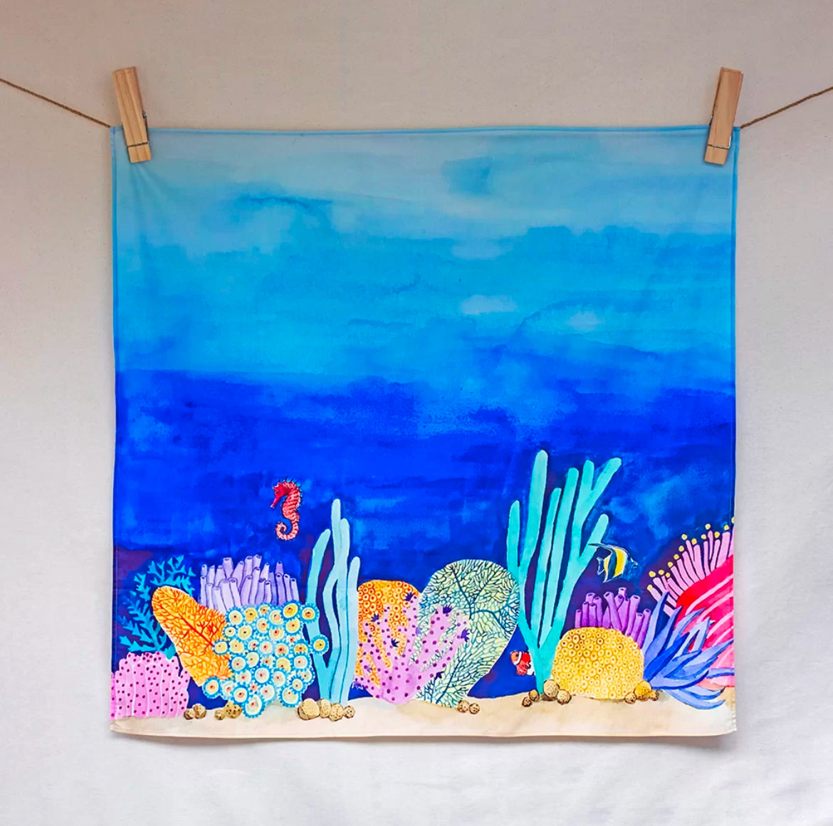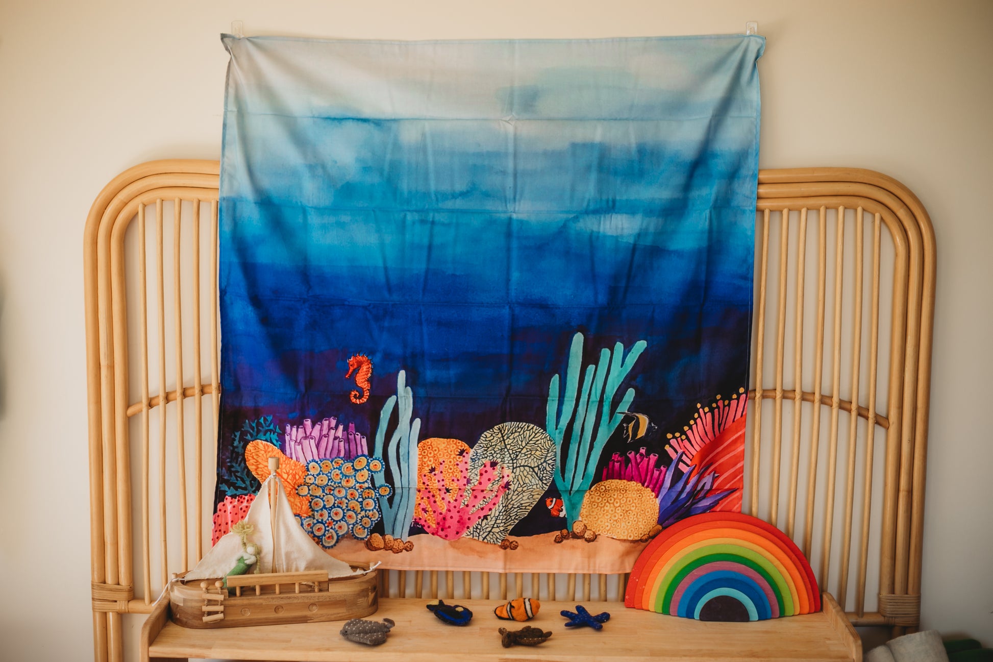 Dive into a world of discovery. With playful fish and crabs, majestic sea turtles, and beautiful coral reefs, this cloth is perfect for exploring the wonders of the deep blue.