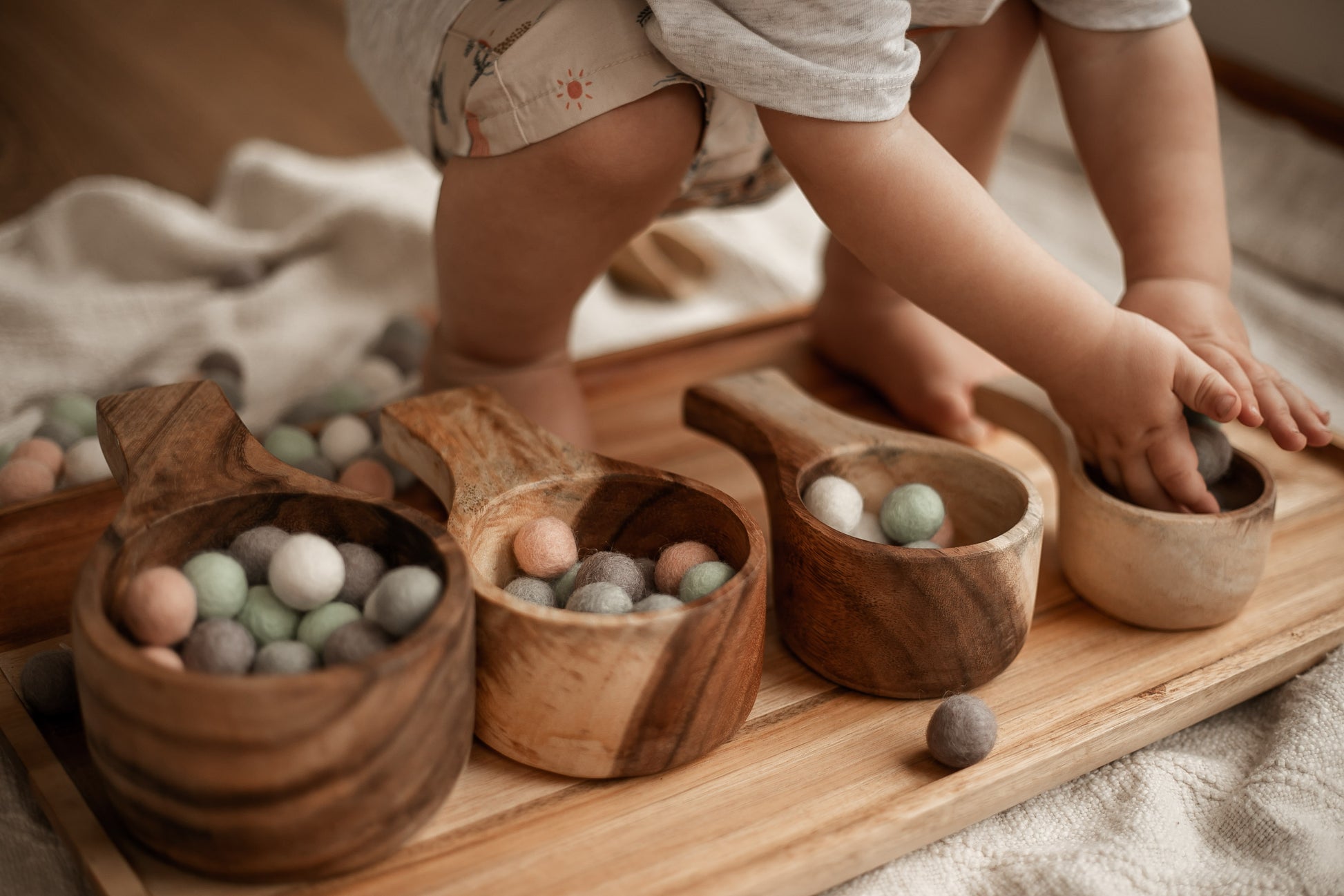 Set of 4 beautiful wooden scoops that are the perfect size for your toddler to handle.